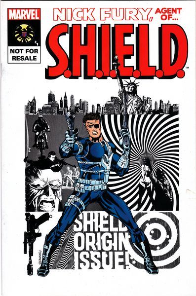 Fury is testing the viability of using L.M.D.s instead of humans as agents to reduce the loss of human life. A sample L.M.D. based on Fury himself is felled by four gunshots, but Fury only fired three during the test. Before this mystery can be unraveled, Scorpio attacks S.H.I.E.L.D. headquarters, claiming credit for the assassination of Nick Fury. The real Fury arrives, and beats Scorpio in hand combat, but doesn’t get the chance to unmask him before he’s shot by stray fire from a nearby and unrelated robbery.